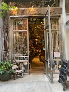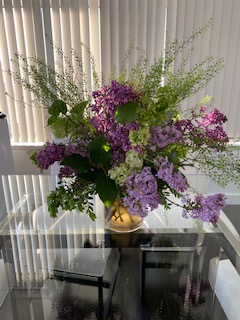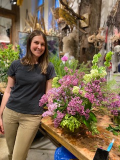 If you could spend an afternoon with two of your most favorite people on the planet (daughter Wendy and granddaughter Rian to be more specific) learning to make a gorgeous spring flower arrangement who would you choose to be your private instructor? If you were lucky enough to choose Bella Meyer you would be learning at the feet (or hands) of a true master! As my birthday gift Wendy arranged an afternoon session for the three of us with Bella in her magical flower shop, fleursBELLA located in Greenwich Village. She is a very warm, relatable & charming alchemist with an impressive pedigree. She earned a Ph.D. in Medieval Art History in Paris where she was born and raised, then after moving to NYC she opened her flower shop in 2005 to create “enchanted garden-like arrangements that evoke fantasy and pleasure” which it does, and then some! Imagine our surprise when we saw what looked like an original painting of a lilac garden signed by Marc Chagall, casually sitting on an easel on what we soon discovered was our work table. The painting was surrounded by huge pots of lilacs and various other spring flowers of every size and color ready for us to select from for our arrangements. An original Marc Chagall you might ask, how is that possible? It is totally possible when you are Bella Meyer, his granddaughter!
