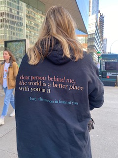 As seen on Broadway and 69th St. yesterday. Maybe the kindest and most surprising sweatshirt saying ever! (I actually ran after her to ask if I could take this photo)